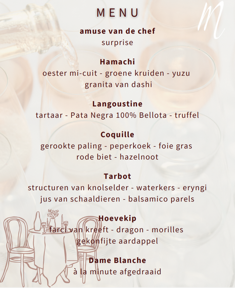 Wil je je laten verrassen, of toch liever een kijkje nemen? Ontdek hier het menu, samengesteld door Chef Lode Van der Auwera.